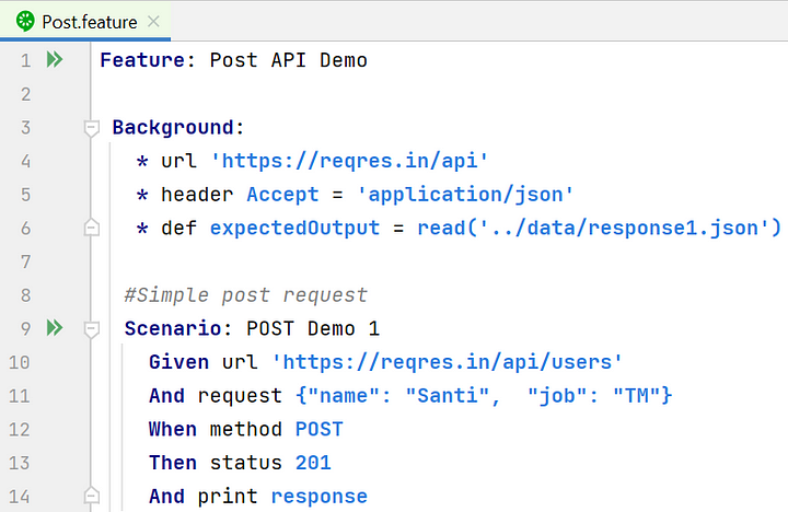 In this test case, I add a background that I will use in different scenarios. First, I set up the URL (where the API is), and the header needs to send the data and the expected output. The header and response are located in another folder in the project called “data.”