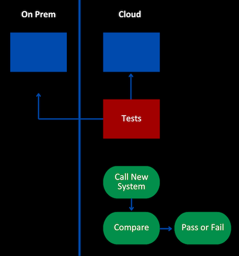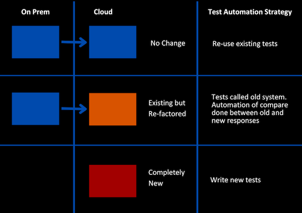 The testing strategy becomes greatly simplified. The same test suite that was built for the application on-premise can be run against the cloud deployment. If the tests pass, the system is ready to go live on the cloud.