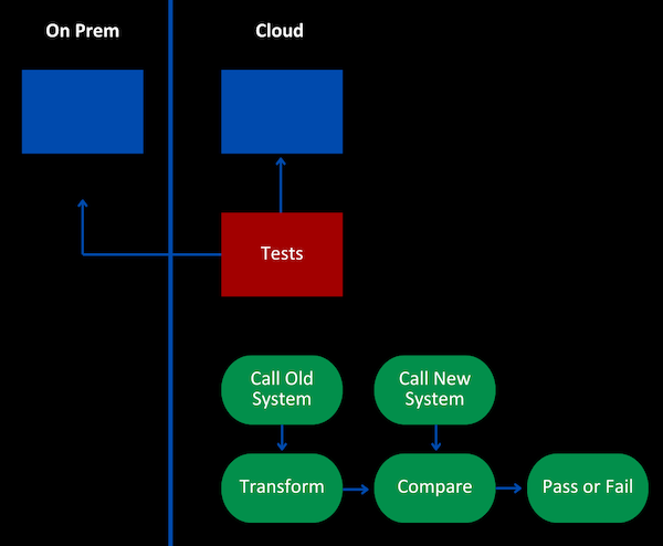Figure 3 depicts the steady state, where the steps of calling the old system and performing a data transform have to be removed. The tests are now standard functional and regression tests where API responses are compared with an expected baseline.